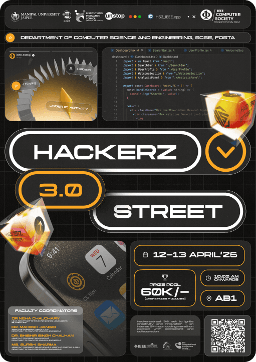 Hackerzstreet 3.0 is organized by IEEE Computer Society, Manipal University Jaipur, a community dedicated to fostering technical excellence and innovation. As a part of IEEE CS, we have a legacy of hosting impactful tech events, including hackathons, workshops, and coding challenges.